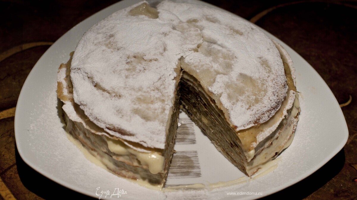 - Шаг 1испечь блины и приготовить крем, взбивая сыр маскарпоне или сметану (лучше всего, дать ей стечь, заранее подвесив на ночь в марле)с сахарной пудрой и ванилином. Отдельно взбить белки в сухой емкости до устойчивых пиков, аккуратно добавляя в готовую массу. Первая начинка готова. Для второй - пассировать нарезанные бананы в сливочном масле до золотистого цвета, добавить сахар, мед и корицу и довести до состояния легкой карамелизации. Смазывать блины, чередуя начинки. Сверху посыпать сахарной пудрой через ситечко и дать настояться в холодильнике пару часов, а лучше ночь ))