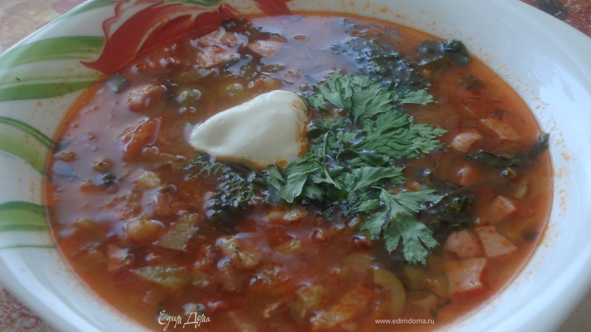 Когда картофель сварится надо размять его толкушкой в бульоне. Затем засыпаем уже приготовленную нами поджарку, а также порезанные: колбасу, сосиски, оливки и добавим 3 ст.ложки рассола из оливок. Специи добавляем по вкусу. - Шаг 4