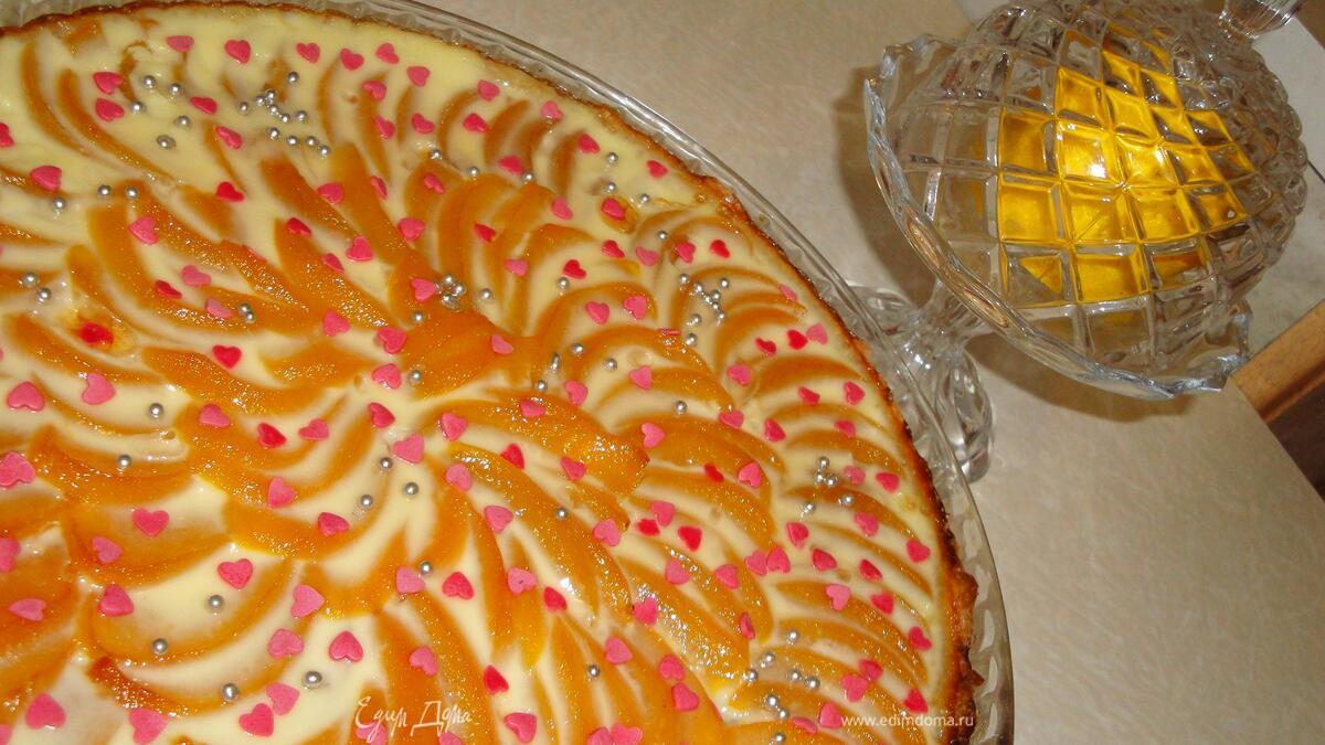 Приготовьте начинку. Порежьте дольками персики. Как только пропечется корж, выложите их на корзиночку из теста. Необходимо посыпать коричневым сахаром. - Шаг 3Сделайте заливку. Взбейте яйца с сахаром и добавьте молоко. Все залейте яично-молочной смесью и поставьте в духовку. Через полчаса пирог готов. Остаётся только посыпать сахарными украшениями!