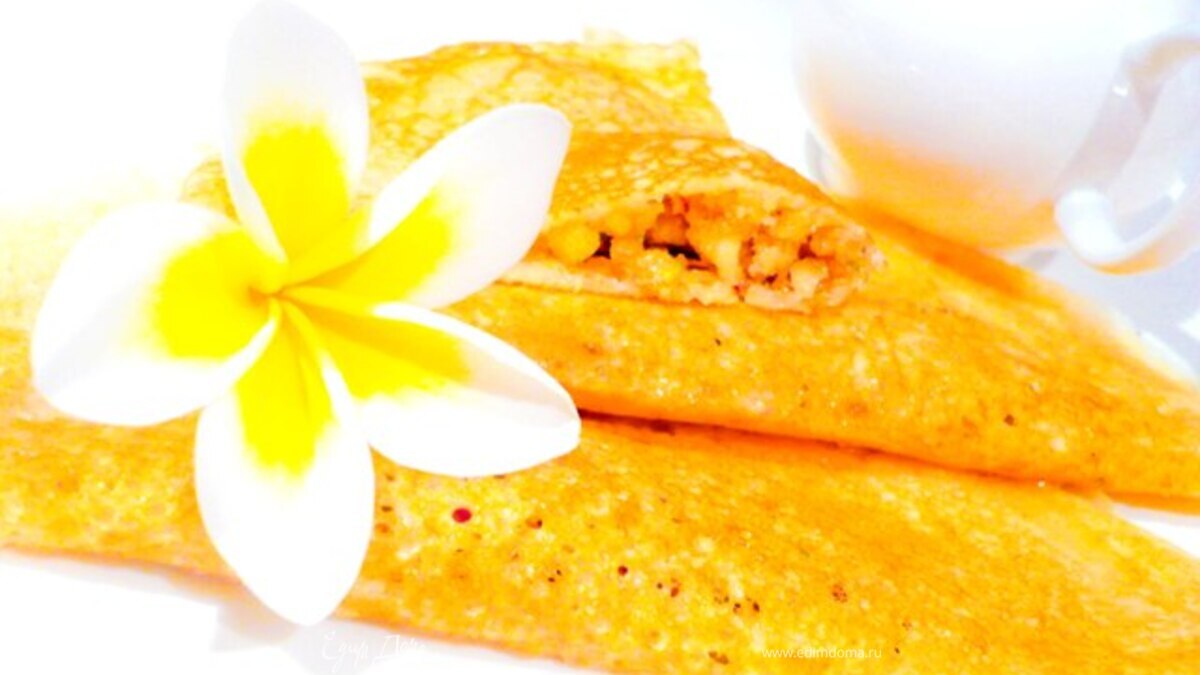 Немного протирая сковороду маслом, пожарить блины с ОДНОЙ стороны до золотистого цвета. Не волнуйтесь - тесто настолько легкое, что оно не останеться сырым с непражаренной стороны. Я жарю на масле из виноградных семян, так как оно самое нейтральное. На непражаренную сторону, СРАЗУ ЖЕ, как только сняли со сковороды, выложить на одну половинку, но ближе к середине 1 ст.л. начинки, накрыть другой половинкой и прижать края - так они "склеятся". Подавать, полив сиропом.