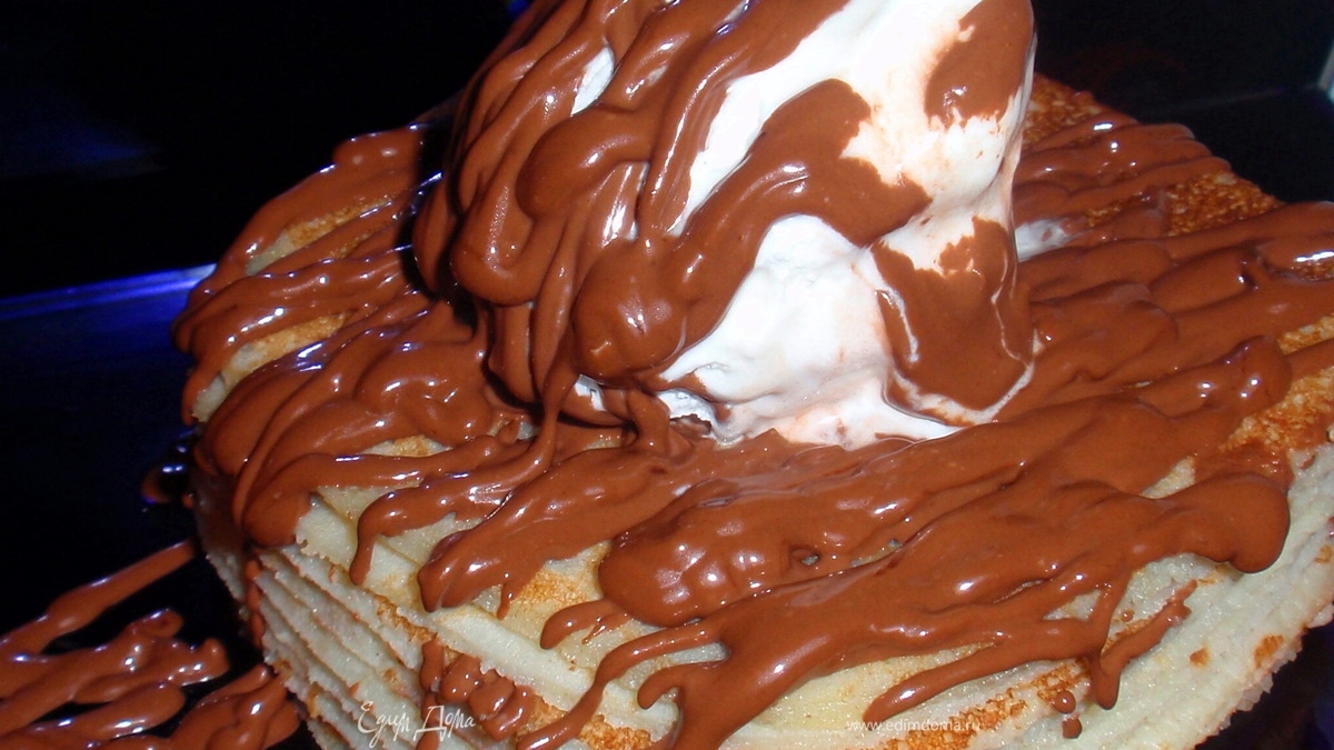 Верхний блин щедро поливаем шоколадом и украшаем шариком ванильного мороженного. Приятного аппетита!!