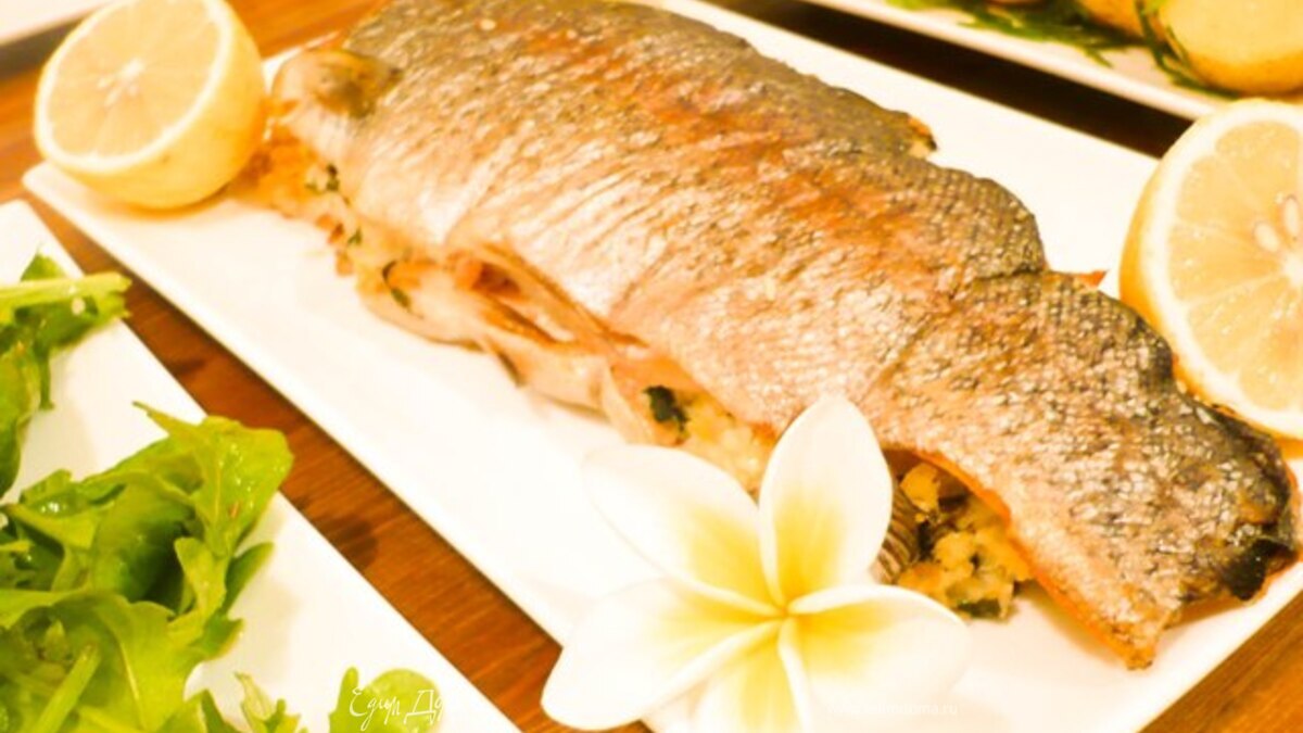 Противень или форму хорошо смазать оливковым маслом. Положить на него несколько отрезков кулинарной нитки. Рыбу порезать на два филе - спинку и животик. Положить животик на нитки и выложить сверху начинку. Накрыть полоской бекона и посыпать тимьяном. Накрыть спинкой и перевязать. Если осталась начинка, распределить вокруг, на противне. Выпекать в разогретой до 220 С духовке минут 15 или пока шкурка не станет немного сухой и хрустящей. - Шаг 3