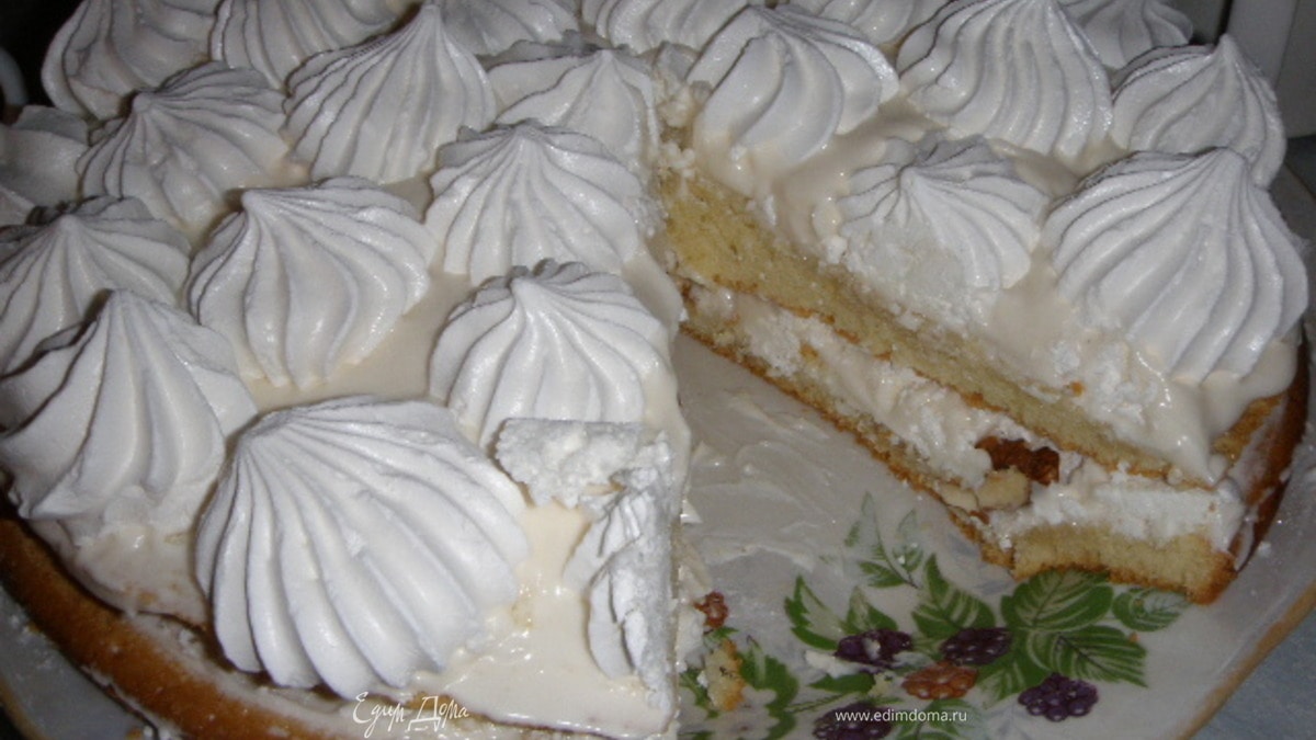 - Шаг 4промазать корж кремом, посыпать орехами и густо засыпать ломанным безе.(Должен получиться толстый слой безе.)Затем промазать кремом сверху безе.