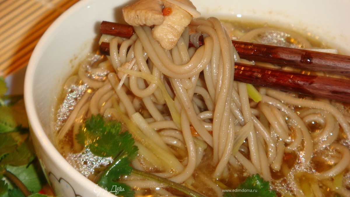 - ПодготовкаНа смеси растительного и кунжутного масла сначала обжариваем чеснок, затем мясо курицы, затем добавляем нарезанное кубиками филе помидора. ДОбавляем куриный бульон, соевый соус, устричный соус, мелконарезанный чили, доводим все это до кипения и закладываем лапшу, варим до готовности.В конце добавляем нарезанный "лапшой" лук порей и присыпаем кинзой.