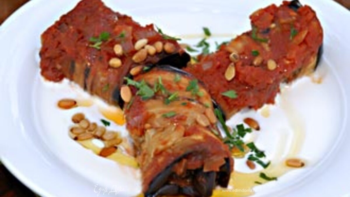 В запеченные и остывшие баклажаны положить начинку.Завернуть. Выложить на тарелку.Полить томатным соусом.Сверху украсить орешками и нарезанным зеленым луком.