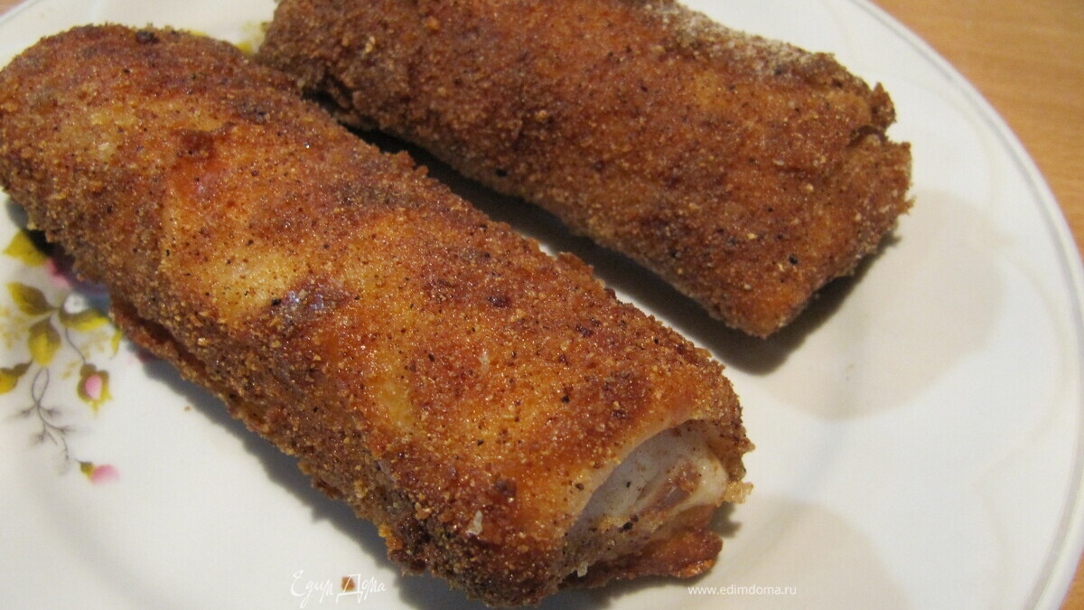 - Шаг 4завернуть начинку в блинчик, слегка взбить 2 яйца, можно добавить к ним ложечку сметанки, обмакнуть блинчик в яйцо, обвалять в сухарях и обжарить до золотистого цвета на растительном масле подавать можно со сметанкой, украсив зеленью приятного аппетита :)