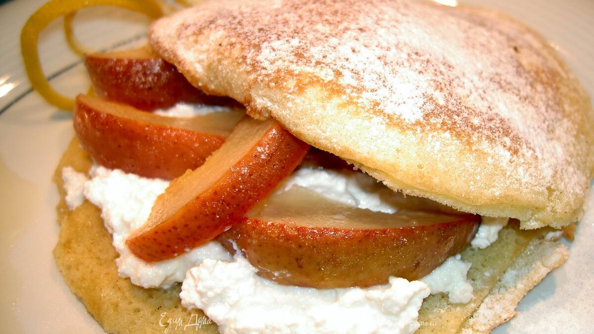 Разложить по 4 блинам сыр рикотта. Покрыть дольками груши, накрыть другим блином и посыпать сахарной пудрой. Разложить по 4 тарелкам с грушевым соусом.