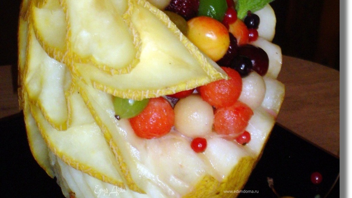 Начнем приготовление "фруктовой сказки" с вырезания шариков из дыни и арбуза с помощью ложки-нуазетки (или нарезаем кубиками). Дыню разрезаем на две равные части (можно вдоль, можно поперек, можно сделать так как у меня), удаляем семена. Одна половина будет служить вазой для нашего десерта, а из второй половины вынимаем шарики. - Шаг 2