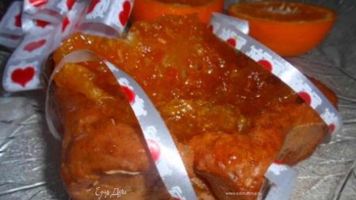 Снять верхнюю корочку с пирожного. Пропитать сиропом в котором готовились мандарины. Сверху выложить мандариновые цукаты.