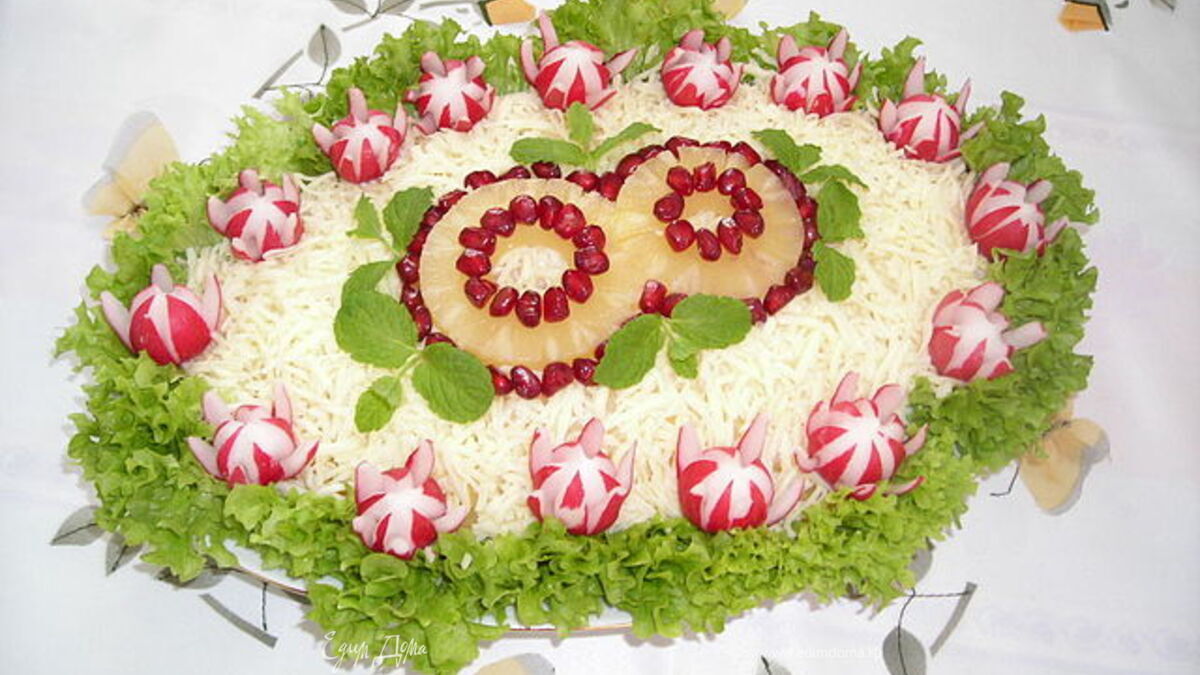 - Шаг 2Берем тарелку на которую будем выкладывать салат. По бокам вкладываем лыстя салата. А дальше так: - 1 слой ветчина, - 2 слой майонез, - 3 слой кукуруза, - 4 слой майонез, - 5 слой яйца, - 6 слой майонез, - 7 слой ананасы, - 8 слой майонез, - 9 слой сыр натертый на крупной терке.