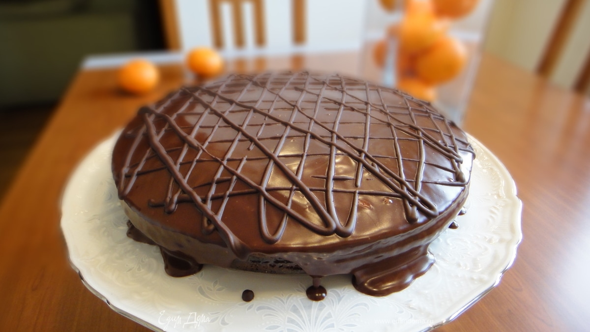 Шоколад со сливками растопить на водяной бане и украсить полученной массой торт. Лучше его оставить ещё часа на три для пропитки.