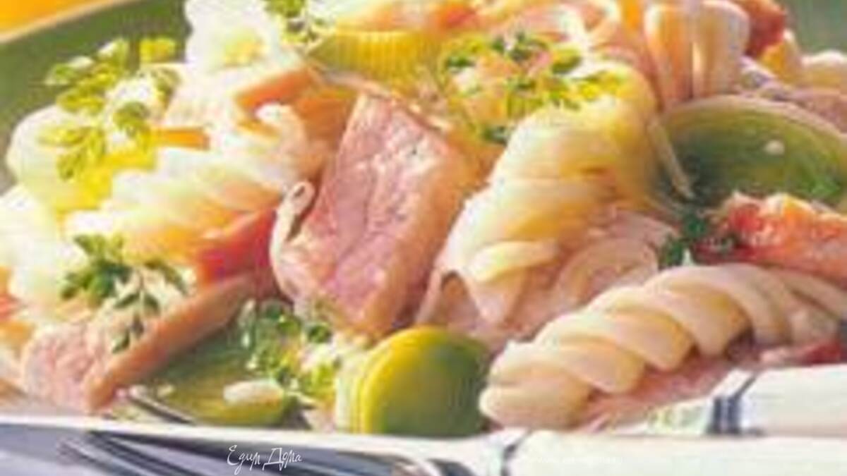 Макароны с сыром, луком-пореем и свиной грудинкой