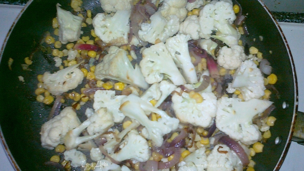 - Шаг 4Добавить чили, кукурузу, цветную капусту и жарить до готовности.