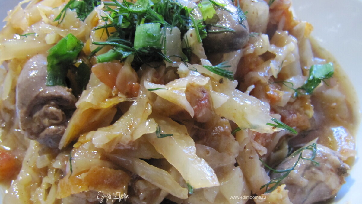 - Шаг 3Нашинковать капусту, отправить в кастрюльку к сердцам и зажарке. Посолить, поперчить, добавить лавровый лист, специи (подойдет мускатный орех, кориандр или ваши любимые специи). Тщательно перемешать, тушить на медленном огне 1-1,5ч. Если для тушения используете мультиварку, то смешать все в любой емкости, после чего выложить в кастрюлю от мультиварки и готовить в режиме тушение 2ч. Подавать украсив мелко порубленной зеленью. Приятного аппетита:)