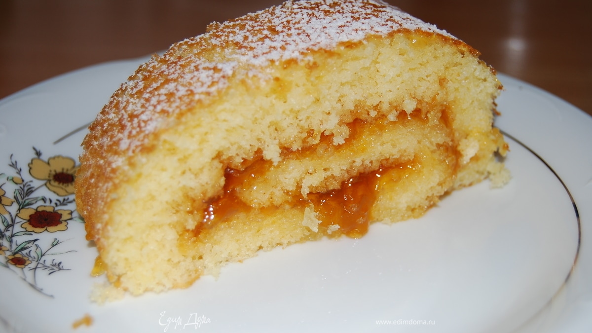 - Шаг 1Из предложеных продуктов делаем жидкое тесто. Выливаем тесто на противень, на предварительно смазаную маслом бумагу для выпекания. Выпекаем при 180 град. 15-20 минут. Ещё тёплый пласт бисквитного теста смазываем абрикосовым джемом и сварачивем в рулет. Даём остынуть рулету окончательно.