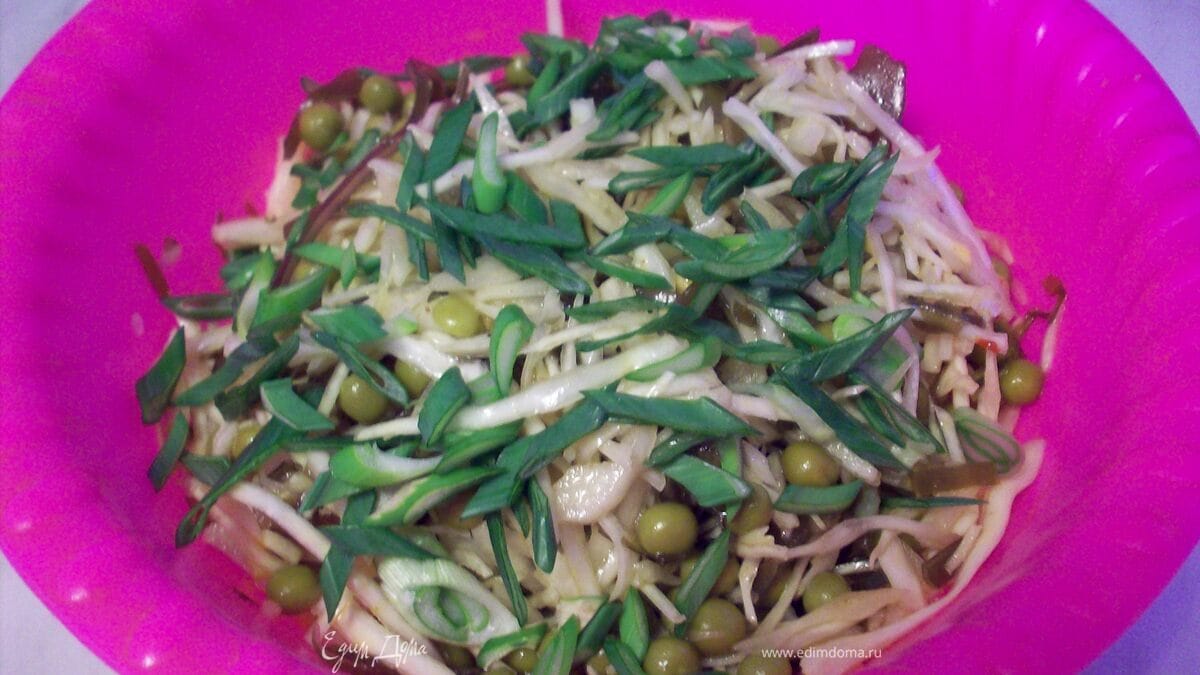 Добавить к капусте белокочанной капусту морскую, зеленый горошек, заправку для корейской морковки и оливковое масло. Тщательно размешать. - Шаг 3