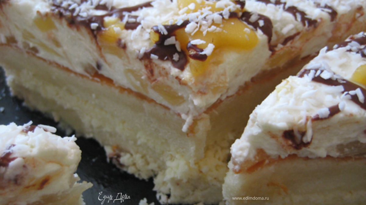 - Шаг 1желтки взбить с 90грам.сахара и белки тоже,взбитые массы соединить добавить муку с крахмалом.Выпечь корж.Сливки довести до кипения добавить шоколад,стружку и ликёр.Корж разрезать пополам и смазать кокосово сливочным кремом.На второй уложить ананасы.Сделать крем из творога и лимонного сока с добавлением ананасов. Желе растворить с сахаром и добавить в творог всё охладить.Крем уложить на верхний корж и убрать на ночь в холодильник.Украсить кокосовой стружкой и шоколадом.