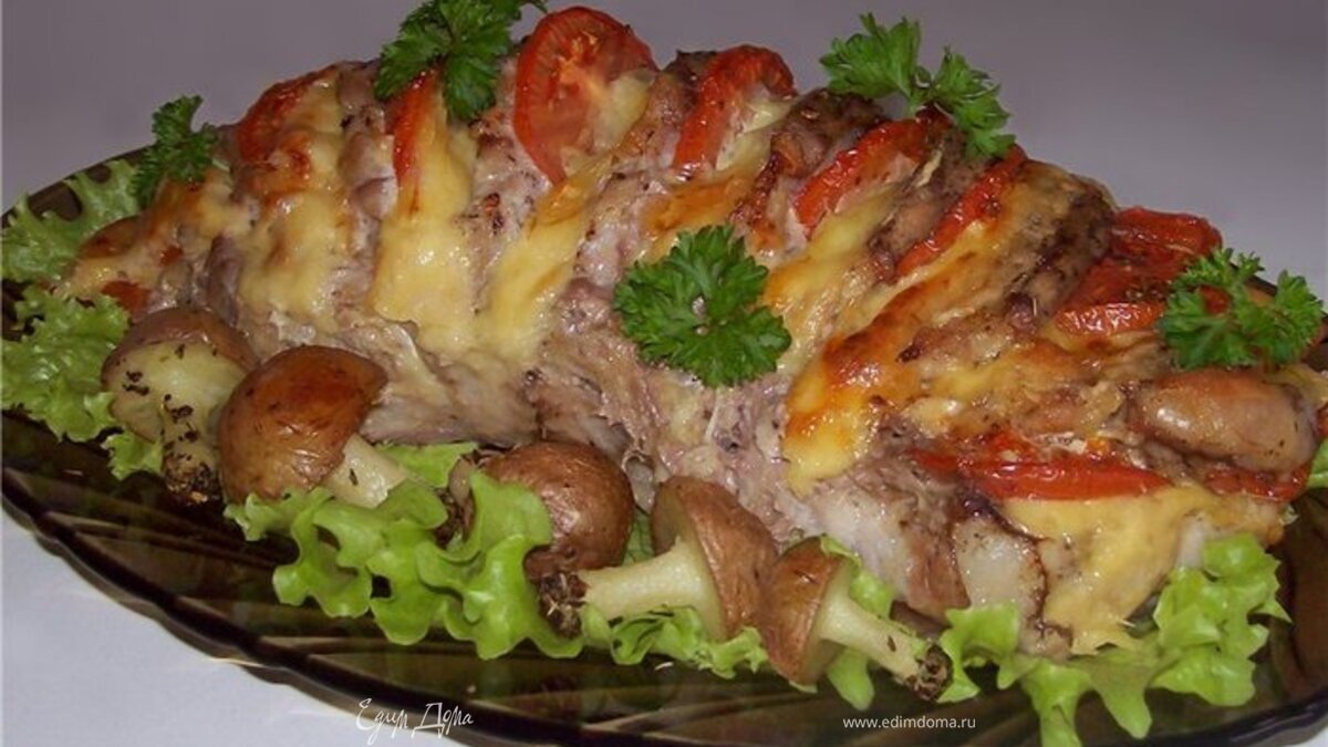 - Шаг 1Корейку одним куском надрезать не до конца.Проложить в надрезы ломтик сыра,кружок помидора,посолить поперчить и добавить чеснок с лаврушкой. Завернуть в рукав для запекания или фольгу.Рядом уложить грибочки сделанные из картошки.Надрезать картошку чуть больше половины по кругу но не до конца и вырезать из нижней части ножку окунув её в хмели-сунели.Да картофель не чистим.