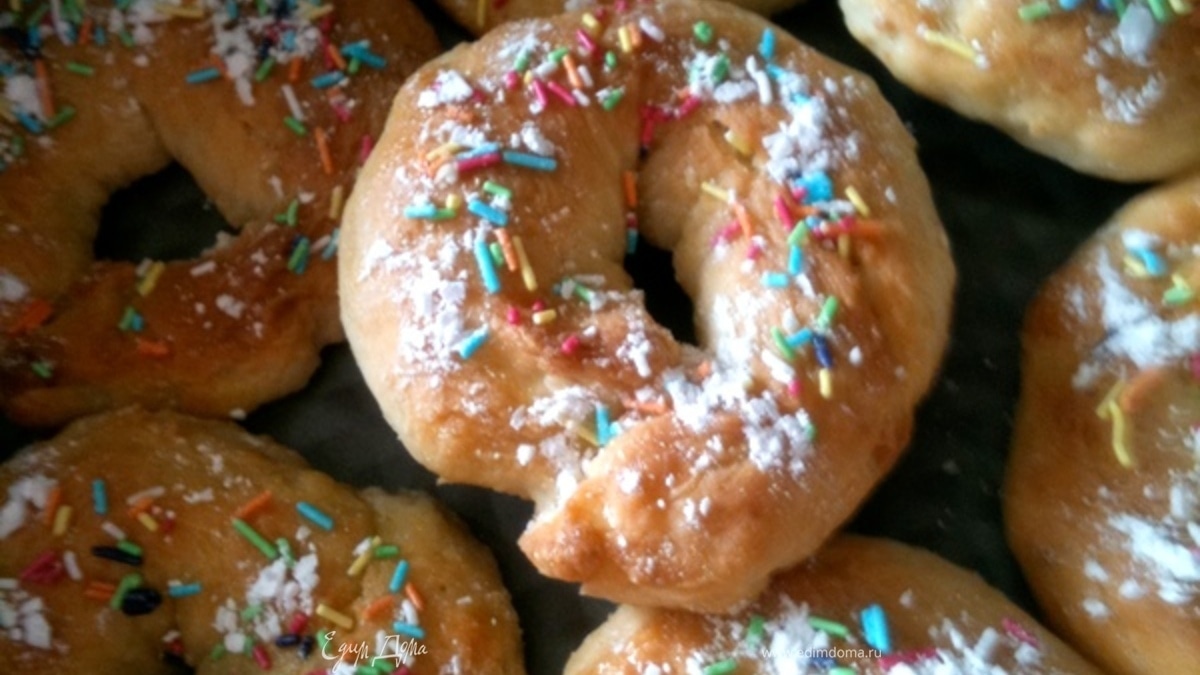 Взбить яйца с сахаром, добавить творог, все взбить в блендере, затем добавить муку, смешанную с разрыхлитем. На столе, присыпанным мукой, скатать руками "колбаску", концы скрепить в "пончик". Выпекать в духовке 25-30 минут при 180 градусах. - Шаг 2Растопленное сливочное масло смешать со ст.л сахара. Смазать готовые пончики этим маслом, сверху сразу украсить посыпкой, чтобы прилипла хорошо!:) Я еще немного сахарной пудрой присыпала.