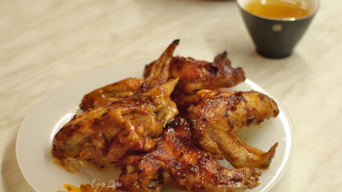 Смешать аджику с медом и в этом маринаде замариновать крылышки на 2 часа (под пресс). Затем выложить в форму, залить маринадом и запекать в духовке при 190 градусов 30-40 минут (зависит от духовки), иногда поливая образующимся соком.