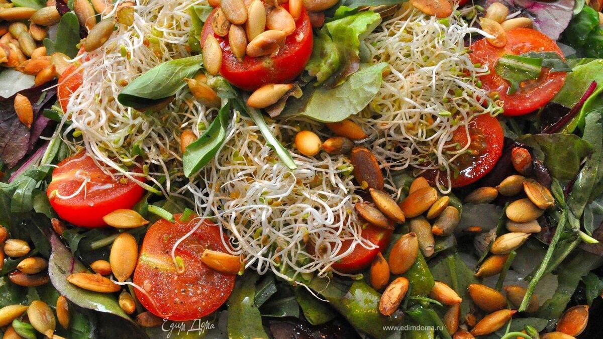 Теперь украшаем салат половинками помидорок, ростками люцерны и поджаренными тыквенными семечками. Еще чуток соли, перца, лимонного сока и оливкового масла. Подаем салат с поджаренными зерновыми тостами. Этот салат очень вкусный и необычный, он прекрасно разнообразит ваше постное меню! Поститесь приятно!