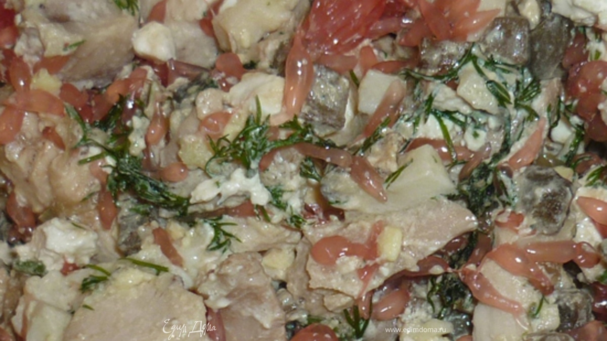 - Шаг 1грибы обжарить с луком,куриное мясо отварить и яйца.Грейпфрут очистить от плёнки и перегородок.Всё порезать смешать и заправить соусами.Специи по вкусу.