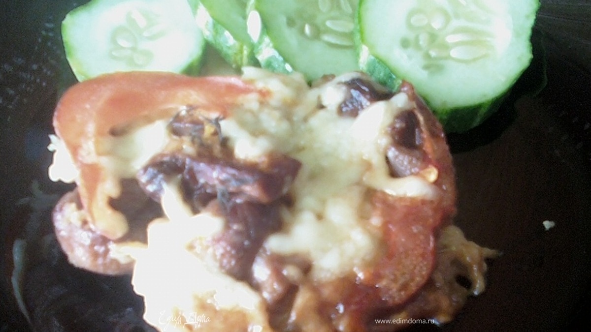 Украсить помидорами и посыпать сыром (идеально подойдет эмменталь). Поставить в микроволновую печь. Время приготовления 15мин. при максимальной мощности.