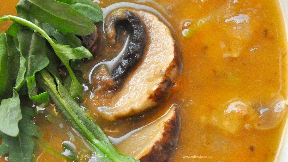 Томим наш суп минут 15, периодически помешивая, после чего снимаем с огня и даем настояться 20-30 минут под крышкой. Теперь разливаем по тарелкам наш ароматный суп, поверх выкладываем крупные дольки грибов и украшаем рукколой или базиликом. Приятной вам трапезы!