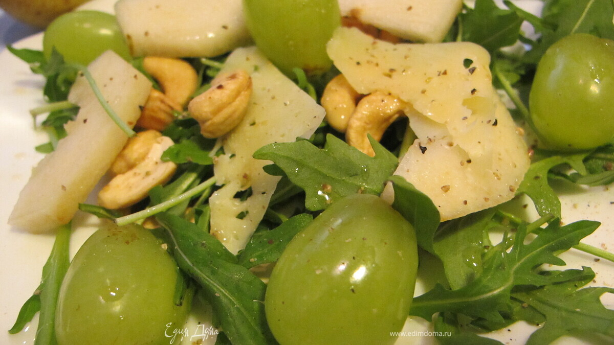 - Шаг 1Все очень-очень просто: Выложить руколу на тарелку, высыпать кешью, виноград. Грушу очистить от кожи и нарезать тоненькими пластинками, выложить в салат. сверху присыпать хлопьями сыра и полить заправкой. Для заправки: Смешать сок мандарина, масло, соль и перец.Для более яркого вкуса можно добавить немного мёда в заправку. Рукола хорошо сочетается с кисло-сладкими нотами. Попробуйте сбрызнуть виноград лимонным соком — это усилит вкус салата