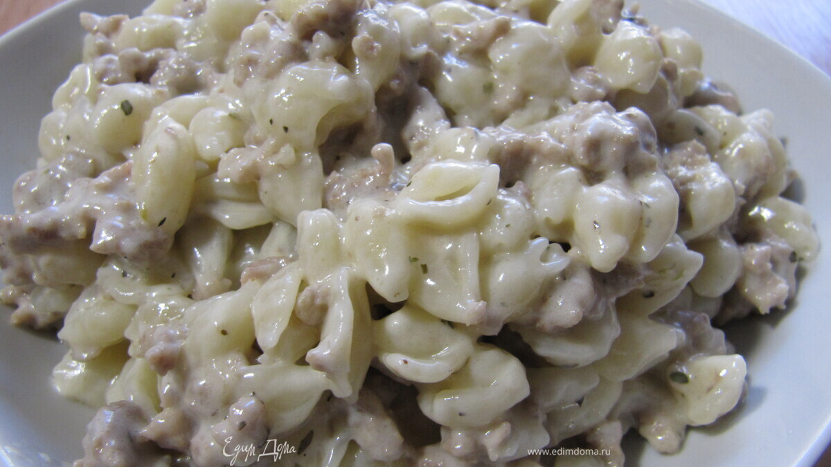 Когда вода закипит, подсаливает ее и всыпаем ракушки, варим аль денте (чуть недоваренные). Пока они варятся, в фарш выливаем сливки и тушим, пока смесь не загустеет, добаляем сыр и держим все вместе минут 5, постоянно перемешивая.