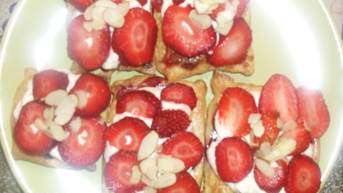 Собираем пирожное: Дать основам остыть,еще раз посыпать слегка сахарной пудрой и выложить на них крем (чем больше, тем вкуснее). А сверху нарезать клубнику. Я еще сверху украсила миндальными хлопьями. И вперед, приятного аппетита)))