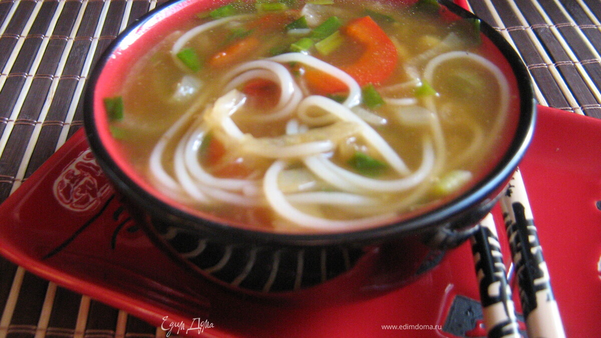 - Шаг 1Репчатый лук очистить,нарезать полу кольцами,зелёный лук вымыть,нашинковать,чеснок очистить,мелко порубить.В кастрюле разогреть сливочное масло,обжарить с начала репчатый лук в течении 2-3х минут помешивая, затем добавить чеснок и зелёный лук,жарить помешивая минут пять.К луку добавить очищенный от семян, нарезанный тонкими полосками болгарский перец,жарить все овощи минуты три помешивая,влить бульон,довести до кипения и варить на маленьком огне 5-6 мину.Соевый соус смешать с крахмалом,добавить в суп.Пока варится бульон с овощами, отварить в течении 6-7 минут в кипящей воде рисовую лапшу,откинуть на дуршлаг,промыть в холодной воде,лапшу опустить в кипящий бульон и сразу выключить огонь.Дать супу постоять 5 минут.Подавать посыпав острым молотым перцем.Приятного аппетита!