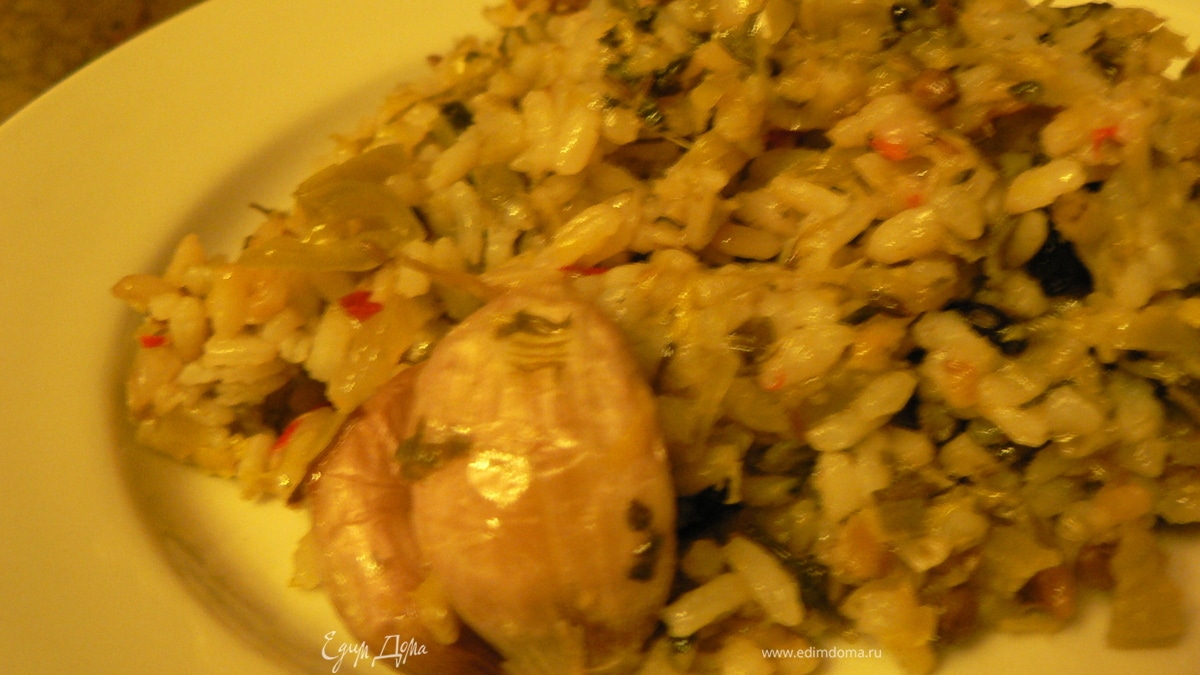 - Шаг 2Разогрейте в казане масло, положите порей. Потушите его до уменьшения в объеме и добавьте сельдерей. Также протушите около 3 минут, добавить перцы. Через 3 минуты добавьте специи и соль, как следует перемешайте и разровняйте овощную массу. Сверху ровным слоем выложите рис, разровняйте. Через шумовку влейте необходимое количество кипятка (так, чтобы рис был покрыт на 2–3 см) и оставьте довольно сильно кипеть в открытом казане около 7 минут.