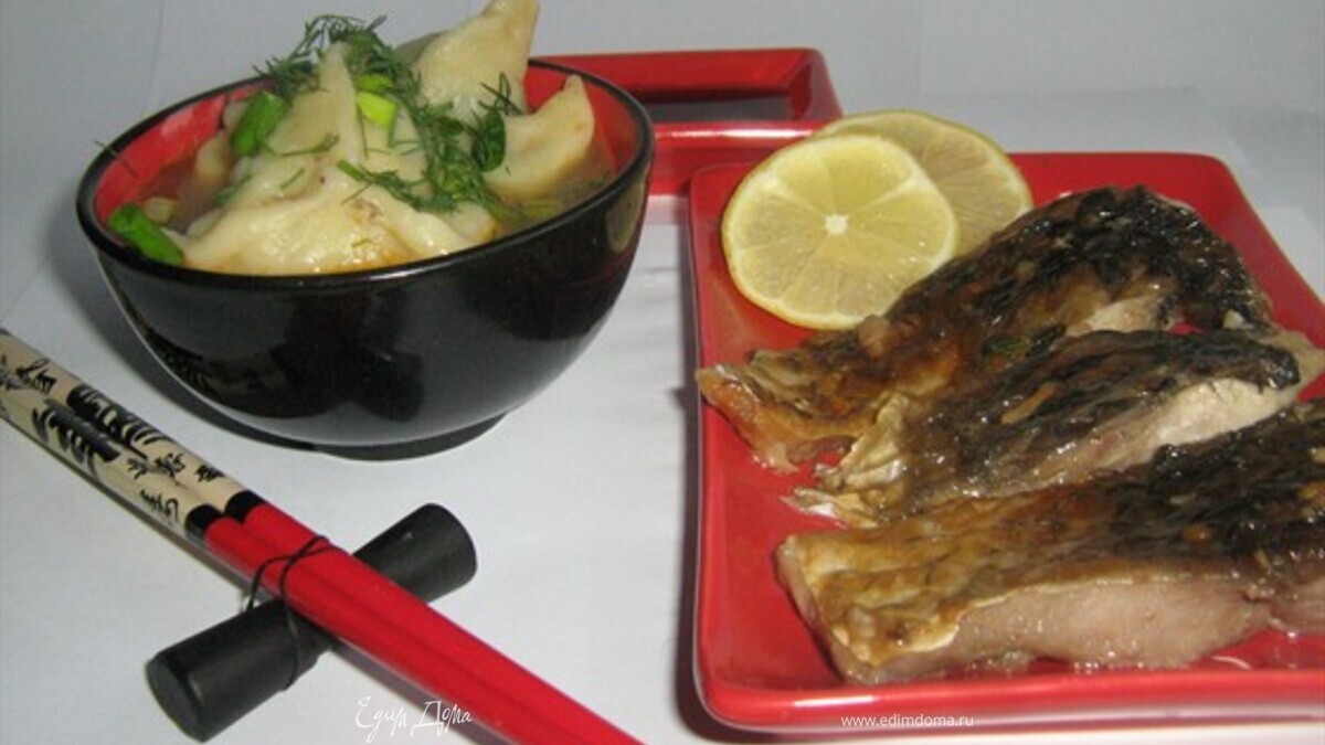 Рыбу очистить от чешуи и внутренностей,удалить жабры.Нарезать рыбу на куски.Голову,хвост и плавники залить водой добавить очищенный лук,морковь,нарезанный кусочками корень имбиря и гвоздику,поставить варить,довести до кипения на не большом огне,снимая пену.Бульон процедить удалив голову,хвост и плавники. В сковороде разогреть раст.масло,обжарить мелко нарезанный чеснок полминуты,добавить 2 ст.ложки соевого соуса,как только соус закипит выложить рыбу,нарезанную на куски и очищенную от костей,жарить с двух сторон по две минуты,затем убрать с огня и оставить пропитываться в сковороде в соево-чесночным соусе. Из яйца,воды(молока,соли и муки замесить пельменное тесто,дать тесту постоять. Креветки залить крутым кипятком на 2 минуты,воду слить,креветки очистить от голов и панцирей(головы и панцири оставить,они ещё пригодятся для рыбного бульона).Очищенные креветки нарезать кусочками,добавить мелко нарезанные зелёный лук и укроп,посолить,поперчить,добавить 1 ч.ложку лимонного соку,перемешать.Дать постоять. Креветочные головы и панцири залить половиной процеженного рыбного бульона,поставить на огонь,довести до кипения и варить минут 10-15 на слабом огне,пока варится креветочно-рыбный бульон займёмся пельменями. Тесто нарезать кусочками, каждый кусочек обвалять в муке,раскатать кружок,в серединку положить чайную ложку креветочной начинки и защипать треугольником. Вторую половину бульона до вести до кипения,забросить пельмени и варить пока не всплывут,то есть до готовности. В глубокую пиалу выкладываем пельмени,заливаем готовым креветочно-рыбным бульоном,на отдельную тарелку кладём кусочки рыбы вместе с соусом,посыпаем зеленью.Украшаем дольками лимона и подаём.Или так: в глубокие пиалы кладём пельмени,кусочек рыбы,заливаем бульоном,добавляем по вкусу лимонный сок и посыпаем зеленью.Приятного аппетита!