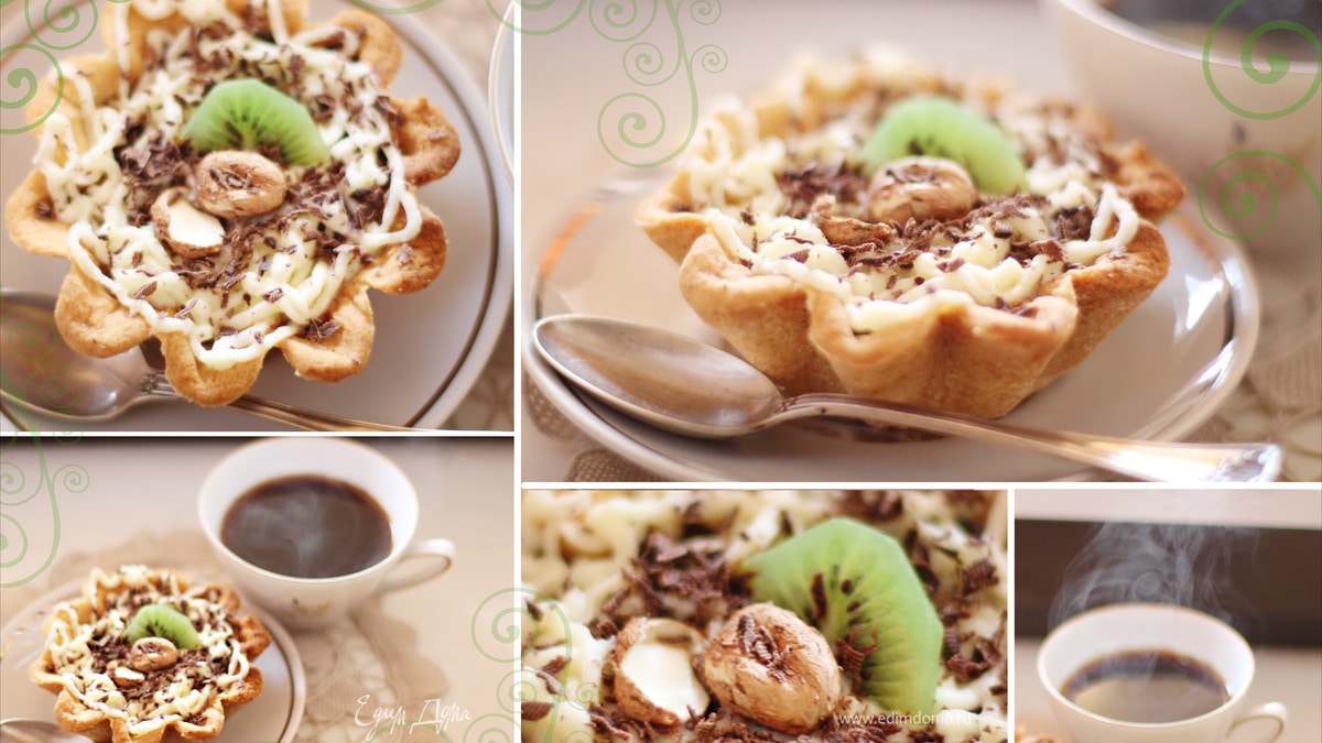 - Шаг 4Формируем пирожные: в корзинку залить шоколад, потом выложить бананы, потом опять шоколад. Дать застыть. Посыпать орешками. Потом украсить масляным кремом, и выложить орешки и киви. Посыпать шоколадом.