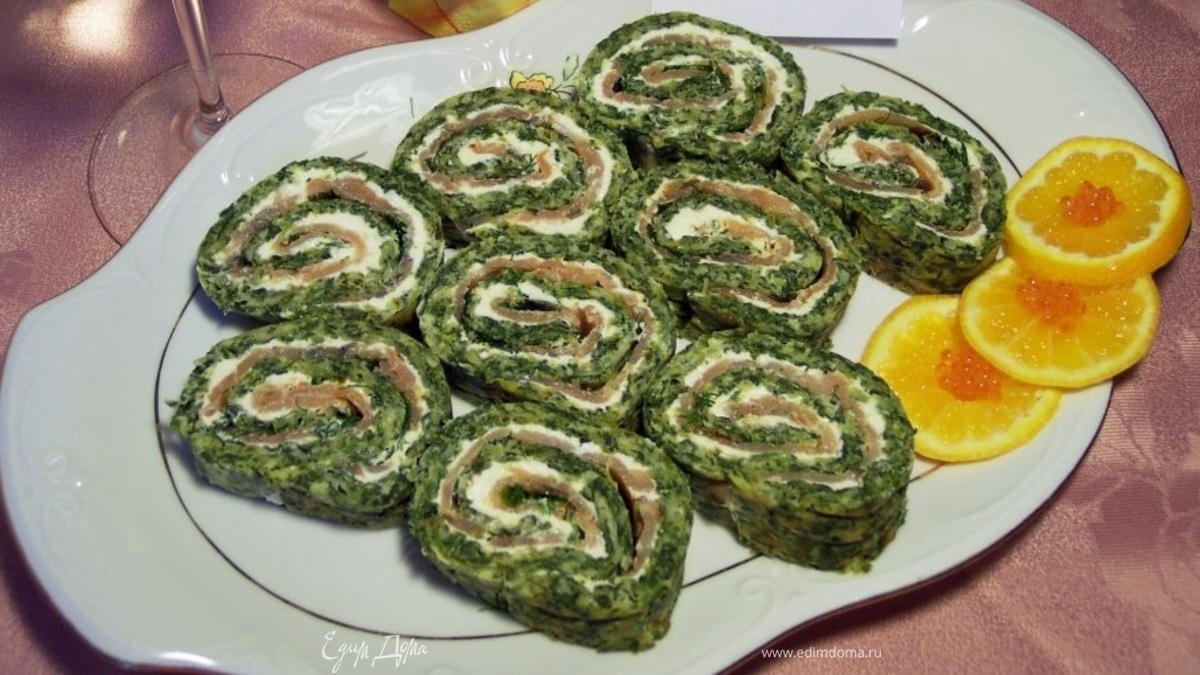Закуска рулетики "красная рыба в шпинате".