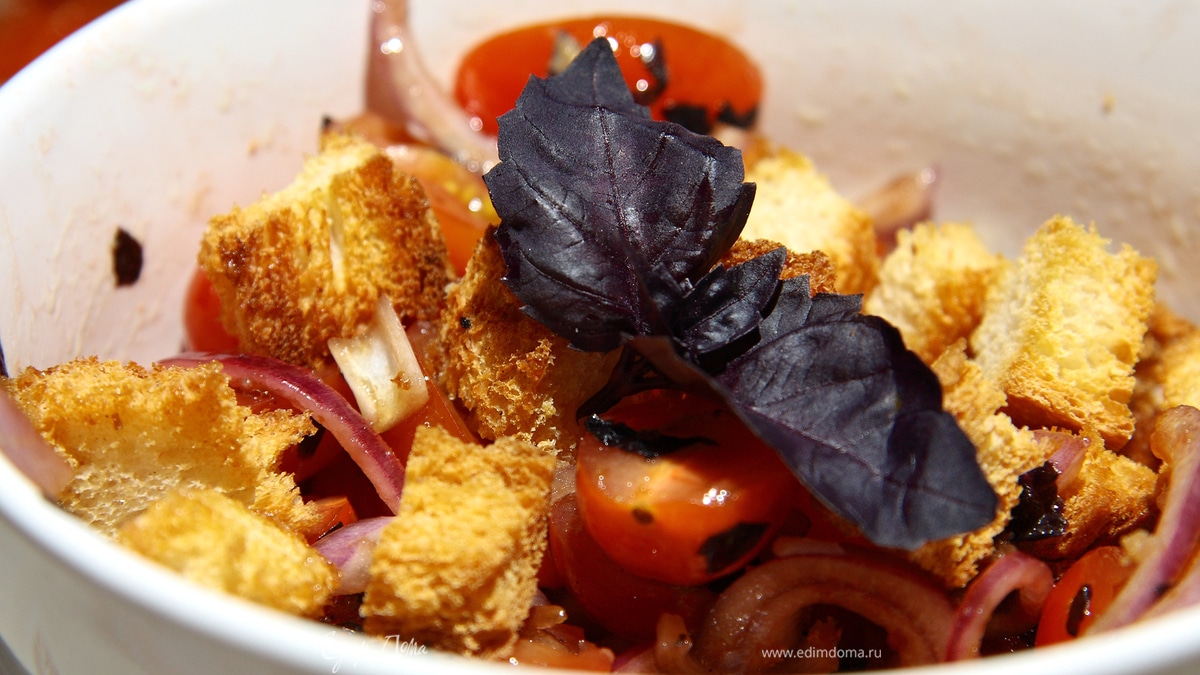 - Шаг 4Заправить овощи, посолить, поперчить, перемешать. При подаче посыпать сухариками и украсить базиликом.