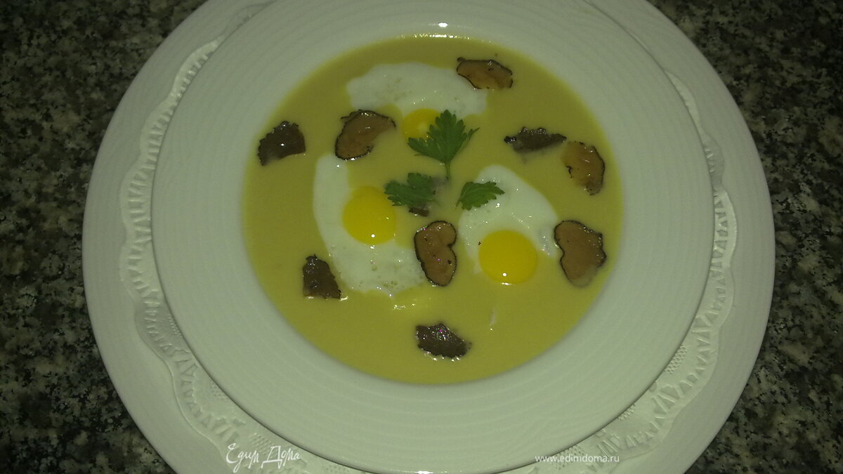Крем суп с трюфелями и перепелиными яйцами (Leek soup with quail's eggs and truffles)