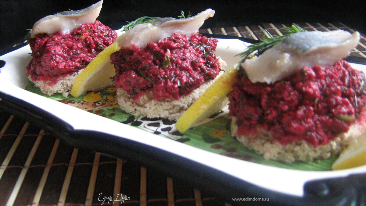 - ПодготовкаОтварную свеклу очистить,нарезать не большими кубиками, орехи обжарить на сухой расколённой сковороде 2-3 минуты,зелень и чеснок нарезать.В чашку положить свеклу,орехи и зелень с чесноком,измельчить с помощью блендера.Добавить лимонный сок, масло, сахар, соль и перец.Хорошо перемешать. На кусочек чёрного хлеба положить свекольное песто, сверху 1-2 ломтика филе сельди. Украсить долькой лимона и зеленью.Очень лёгкая в приготовлении и вкусная закуска.