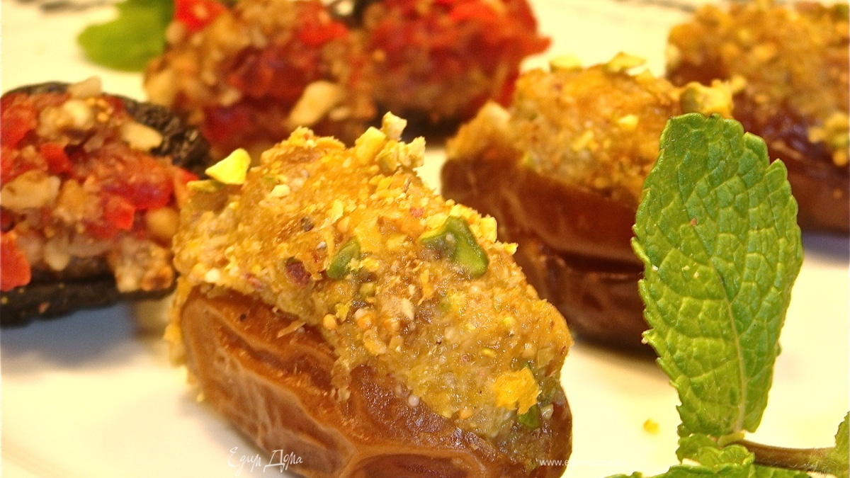 Разрезать финики вдоль, не разрезая их до конца и удалить косточки. Наполнить каждый финик и чернослив примерно 1 ч.л. начинки. Полить сверху растопленным шоколадом (по желанию).