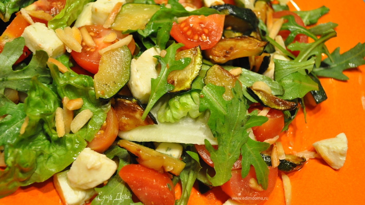 - Шаг 3Режим римский салат, моцареллу, помидоры черри. Добавляем руколу, миндаль, цукини. Солим. Заправляем салат соком лимона.