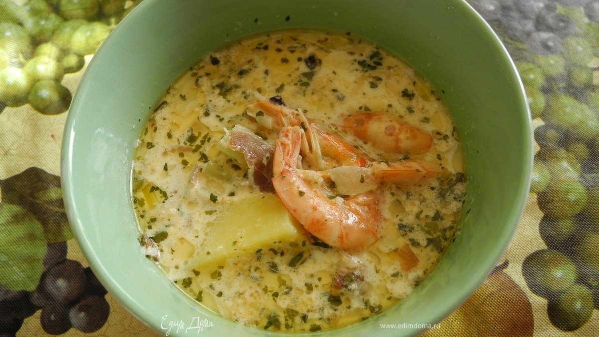 Молоко вскипятить, соединить с беконом и луком, посолить, добавить крупно нарезанный картофель, сельдерей. Рыбу нарезать порционными кусочками, добавить в суп. Когда суп будет почти готов добавить размороженные креветки, петрушку, тимьян и листочек лайма или лимона. Если взять кокосовое молоко и отказаться от сливочного масла и бекона, получится почти постный суп. Очень просто, но получилось, на удивление вкусно. В следующий раз попробую добавить кукурузу.