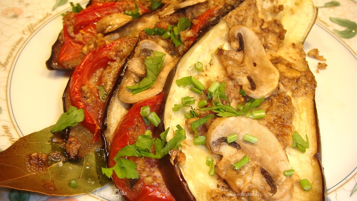 Можно разместить сверху баклажана оливки, шампиньоны, зелень. Запекать в духовке до готовности баклажана, нож должен легко проникать в основание баклажана. Подавать присыпав зеленью.
