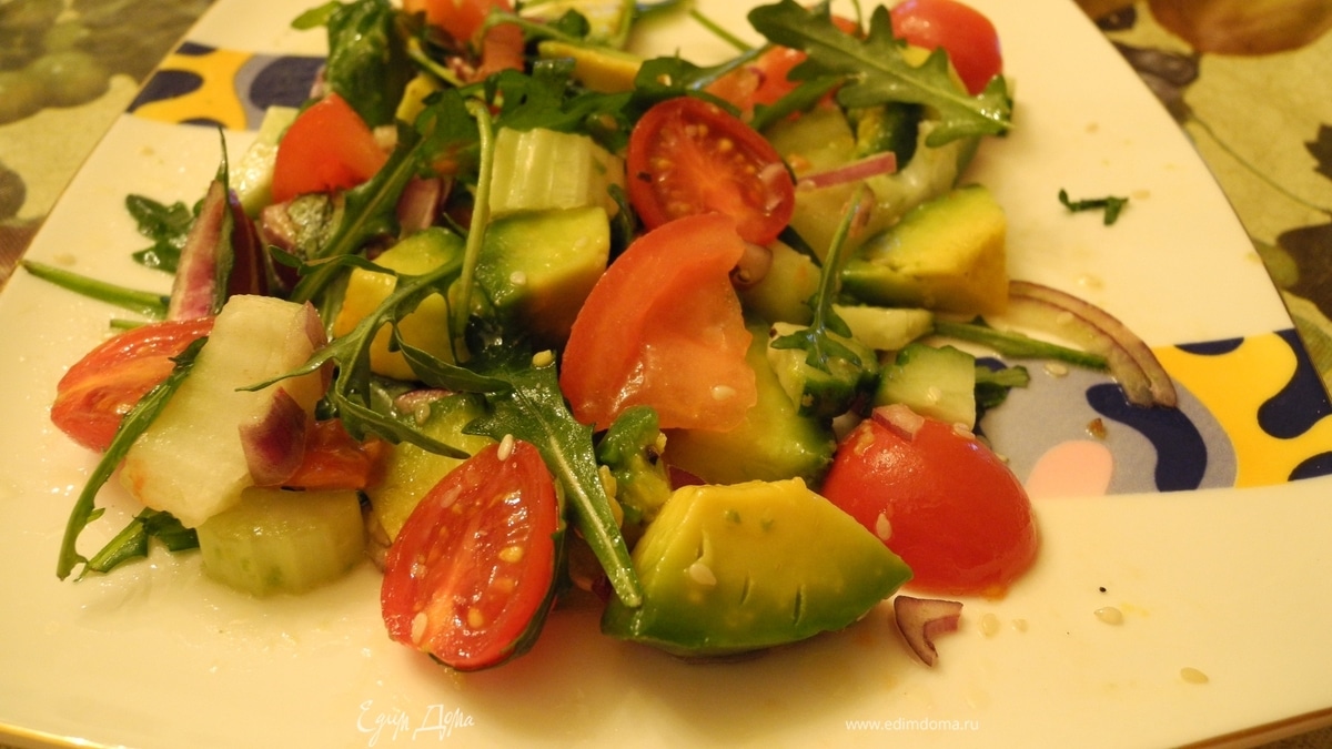 Порезать авокадо, огурец, помидор, сельдерей - кубиками. Лук - пластинками. Аккуратно перемешать с оливковым маслом и лимонным соком. Выложить на "подушку" из руколы, посолить, поперчить, посыпать кунжутными семечками. Приятного аппетита!