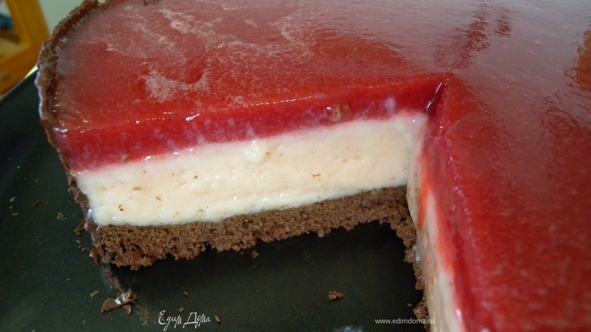 6. Утром я решила проверить тортик. Я развернула верхний край фольги и аккуратно сняла металлическую форму-сердце. потом удалила фольгу. Появилась еще одна ОШИБКА. Шоколад был выше чем желе на 2 см. Я начала срезать лишнее горячим ножом. Желе у меня покоцалось маленько и торт потерял презентабельный вид. В принципе - нормально. Но лучше рассчитать так, чтобы тор был до самого верха и не пришлось ничего срезать. И так как клубничное желе осталось немного мягким оно начало давить на шоколадные стенки (когда я убрала обод и фольгу). И стенки лопнули в некоторых местах)... - Шаг 11Но торт на вкус получился обалденным...