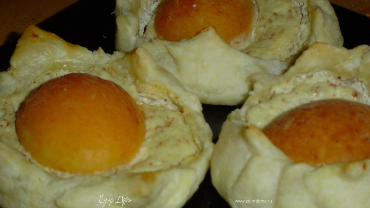 - Шаг 4В центр начинки выложите половинку абрикоса. Защипайте тесто с четырех сторон. Выложите слойки на противень и выпекайте при температуре 180-190˚С 15-20 минут.