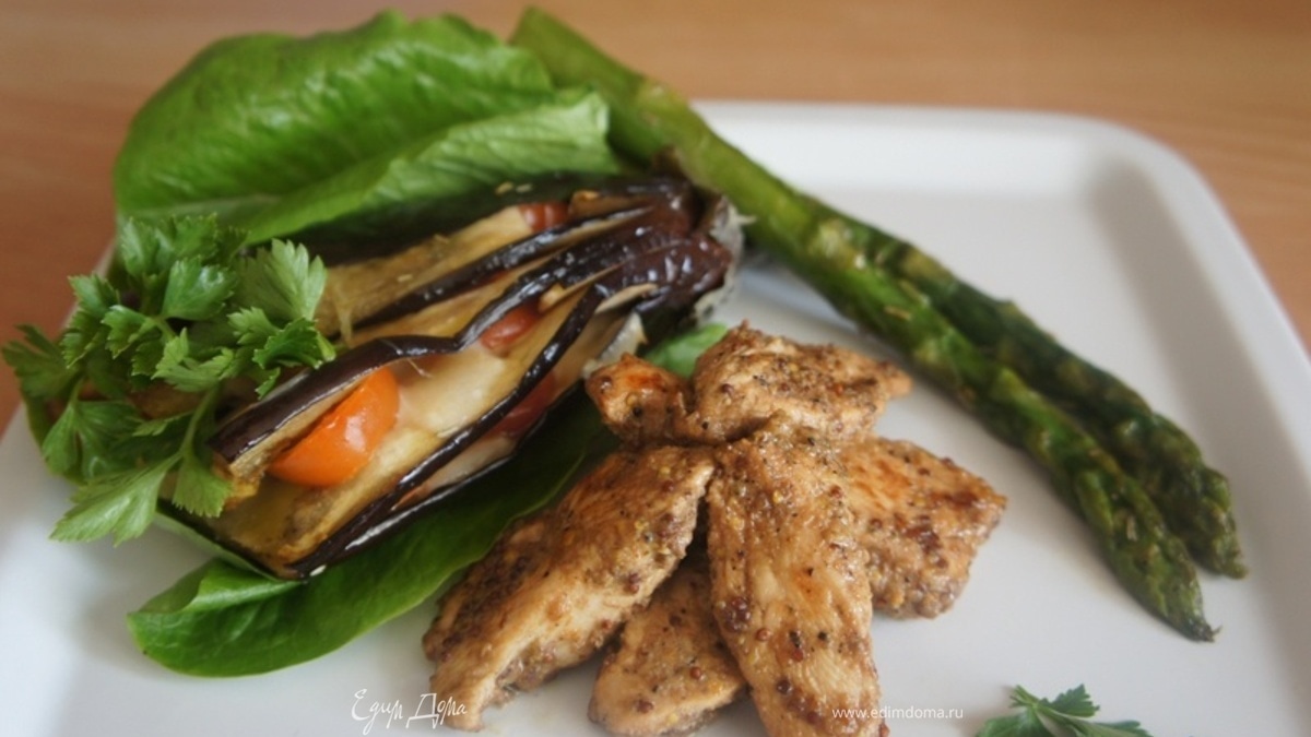 Куриные замаринованные кусочки с баклажаном и спаржей