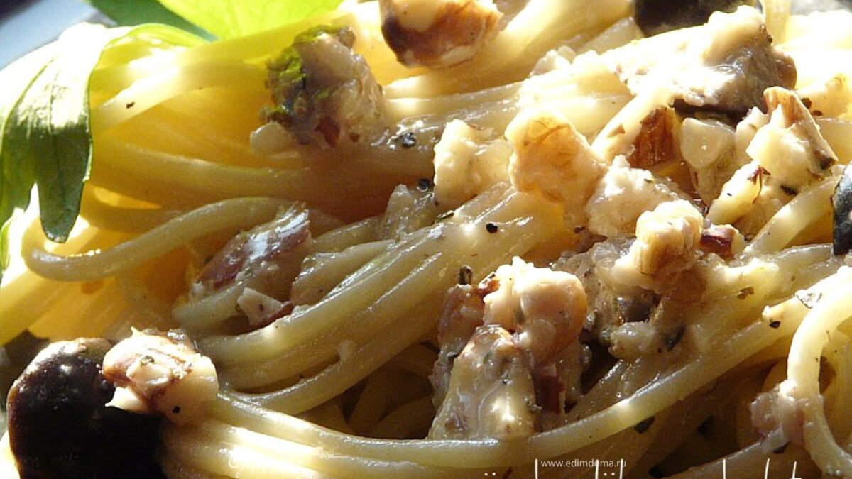 - Шаг 1Сварить пасту до аль денте. Порубить орехи и оливки, смешать их со сливками и маслом, приправить. Смешать спагетти с соусом, порвать сверху ветчину и сразу подавать!