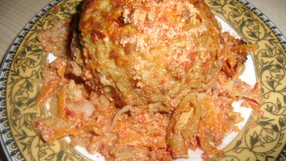 - Шаг 6подлива: порезать лук крупной соломкой и спасировать с морковкой, добавить домашний соус и сметану