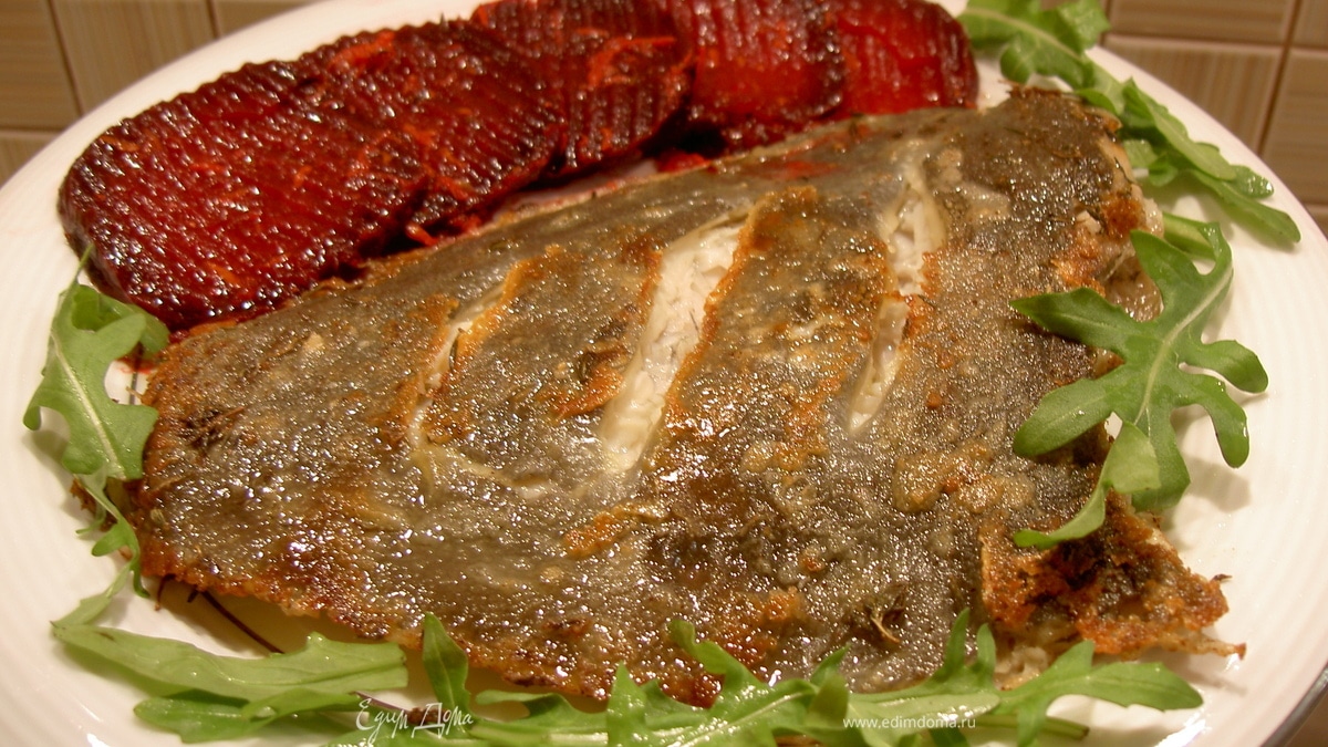 Камбала. Не все любят характерный запах, привкус. Но попробуйте, и вы не пожалеете! Свеклу в таком виде можно употреблять когда захочешь(без рыбы)! А рыбка получается нежнейшая( кожица вся досталась мне, толстая и жирненькая!:))).